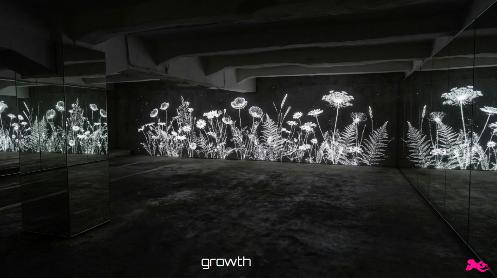 Much like humans, plants cooperate and communicate with one another. They utilize electrical and chemical signals, interacting through their unique frequencies. The sonic component of “Growth” incorporates frequencies beneficial to both plants and humans, serving as the primary inspiration for both the auditory and visual aspects of the installation.